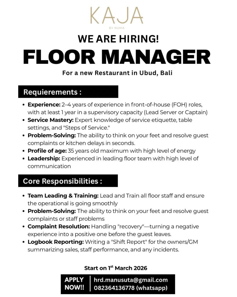 • Profile of age: 35 years old maximum with high level of energy Leadership: Experienced in leading floor team with high level of communication.